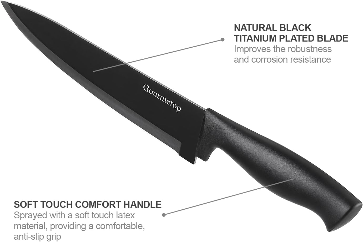 BLACK TITANIUM BLADE & COMFORTABLE HANDLES: The stainless steel blades feature a natural black titanium plating. enhancing non-stick properties. robustness. and corrosion resistance. In contrast to solid PP plastic handles. our kitchen knife handles are coated with a soft-touch latex material. providing a comfortable. anti-slip grip for effortless use.